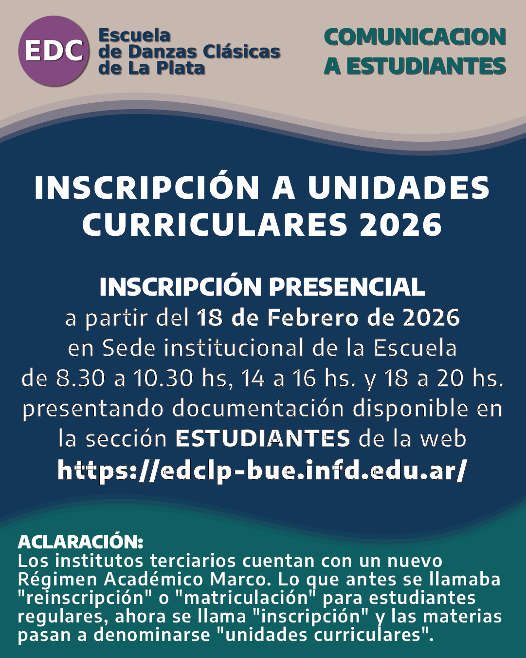 La inscripción a las unidades curriculares se hará en forma presencial a partir del 18 de Febrero de 2026 acercándose a la Escuela en los horarios de 8.30 a 10.30, 14 a 16 y 18 a 20 hs. con la siguiente documentación: